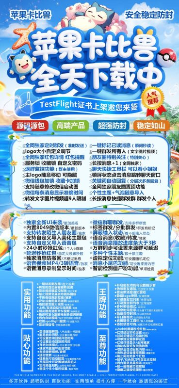 苹果卡比兽作为一款备受关注的微信辅助工具,正通过 TestFlight 证书全天开放下载。它具备诸多实用且强大的功能,在安全稳定方面表现出色,能为用户带来更便捷的微信使用体验。